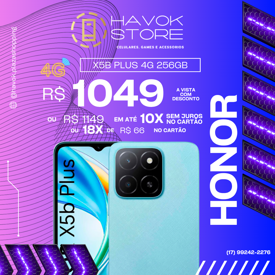 Em até 10x de R$ 114,90 sem jurosEm até 18x de R$ 67,67 com juros À vistaR$ 1.049,00no Pix O HONOR X5b Plus 4G (256 GB) apresenta tela de 6,56″ com taxa de 90 Hz, processador MediaTek Helio G36, câmera principal de 50 MP, bateria de 5.200 mAh e amplo armazenamento, perfeito para seu dia-a-dia com fluidez e espaço agora.