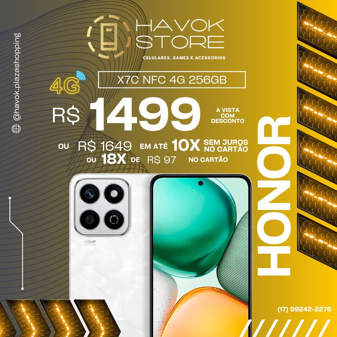 Em até 10x de R$ 164,90 sem jurosEm até 18x de R$ 97,12 com juros À vistaR$ 1.499,00no Pix O HONOR X7C 4G (256 GB) combina tela de 6,77″ com taxa de atualização de 120 Hz, processador Snapdragon 685, câmera principal de 108 MP com profundidade de 2 MP, bateria de até 6.000 mAh com carregamento rápido de 35 W e amplo armazenamento, pronto para acompanhar seu dia com fluidez hoje.