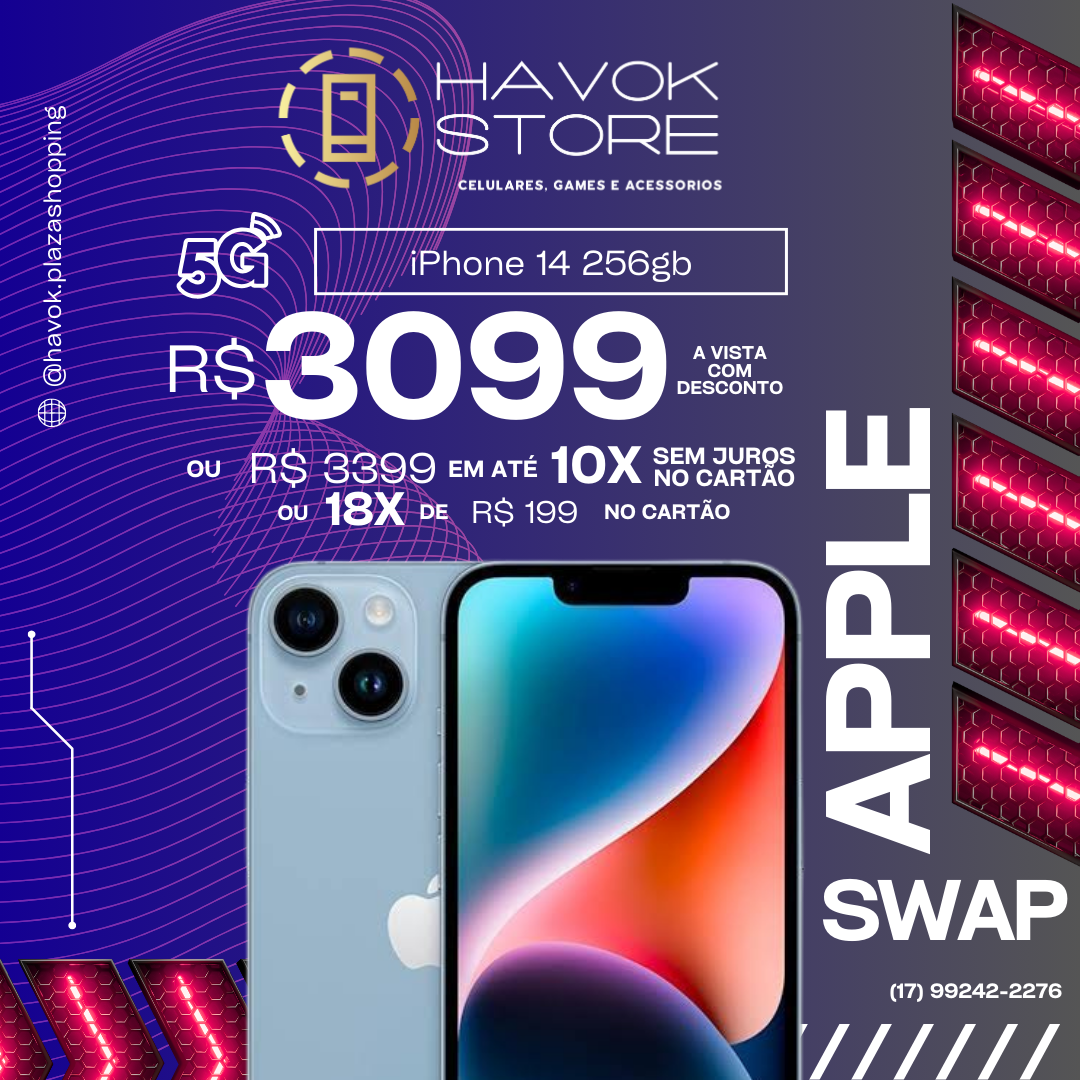 Apple iPhone 14: Tela Super Retina XDR de 6,1″, chip A15 Bionic, sistema de câmera dupla de 12 MP, conectividade 5G, detecção de colisão e SOS via satélite, desempenho confiável e moderno para o seu dia.