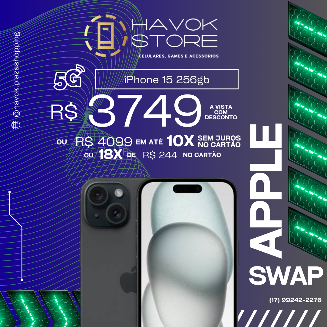 O iPhone 15 oferece tela Super Retina XDR de 6,1″, chip A16 Bionic, câmera de 48 MP com zoom 2x, entrada USB-C e design resistente com certificação IP68, desempenho poderoso e modernidade para seu dia a dia.