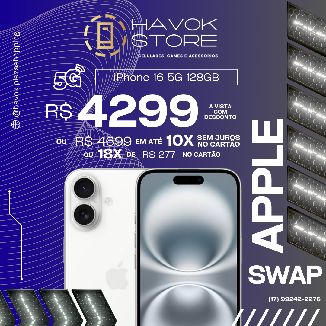 Em até 10x de R$ 430,00 sem jurosEm até 18x de R$ 253,25 com juros À vistaR$ 3.909,07no Pix O iPhone 16 traz tela Super Retina XDR de 6,1″, chip A18 com desempenho até 30 % superior, câmera principal de 48 MP + ultra-wide de 12 MP, suporte a 5G e Wi-Fi 7, USB-C e corpo fino de 7,8 mm, potência e inovação para seu dia hoje.