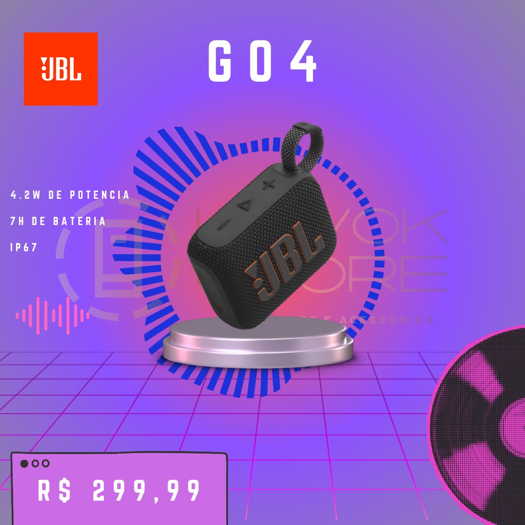 Em até 6x de R$ 56,67 sem juros À vistaR$ 299,99no Pix A JBL Go 4 entrega som JBL Pro surpreendente para seu tamanho com potência de 4,2 W RMS, até 7h de bateria + modo Playtime Boost, certificação IP67 contra água e poeira, conectividade Bluetooth 5.3 e loop integrado para transporte, leve música para onde for hoje.