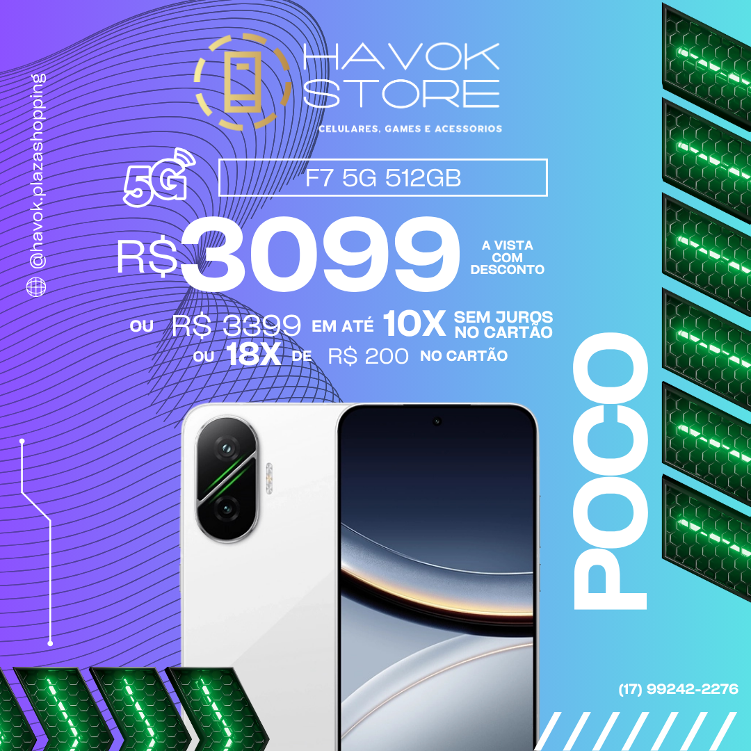 Em até 10x de R$ 339,90 sem jurosEm até 18x de R$ 200,18 com juros À vistaR$ 3.099,00no Pix O POCO F7 5G – 512 GB combina tela AMOLED curva de 6,83″ em 1.5K com 120 Hz, processador Snapdragon 8s Gen 4 de 4 nm, câmera principal de 50 MP com OIS, bateria de até 7.550 mAh com recarga ultra-rápida de 90 W e armazenamento generoso de 512 GB, desempenho, fluidez e espaço para seu dia hoje.