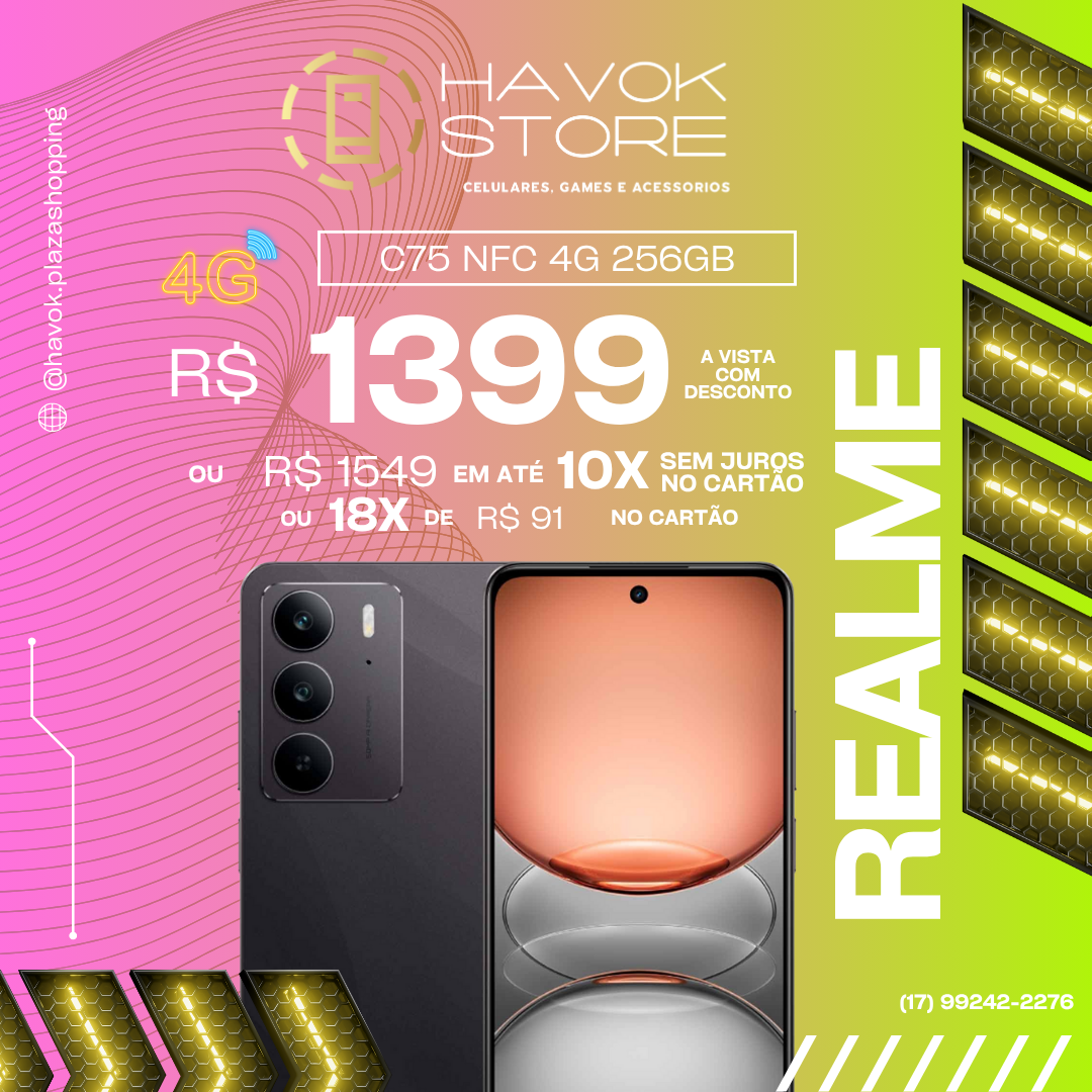 Em até 10x de R$ 154,90 sem jurosEm até 18x de R$ 91,23 com juros À vistaR$ 1.399,00no Pix Descubra o realme C75 4G (256 GB): tela IPS de 6,72″ com 90 Hz, processador MediaTek Helio G92 Max, bateria de 6.000 mAh com recarga rápida de 45 W, câmera principal de 50 MP e armazenamento generoso, desempenho, fluidez e espaço para você hoje.