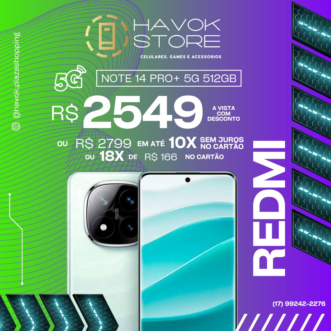 Em até 10x de R$ 279,90 sem jurosEm até 18x de R$ 164,85 com juros À vistaR$ 2.549,00no Pix O Redmi Note 14 Pro+ 5G traz performance de ponta com processador Snapdragon 7s Gen 3, tela AMOLED curva de 6,67″ 1.5K 120 Hz, câmera de 200 MP com OIS, 512 GB de armazenamento amplo, bateria de 5110 mAh com carga ultrarrápida de 120 W e certificação IP68, preparado para tudo hoje.”